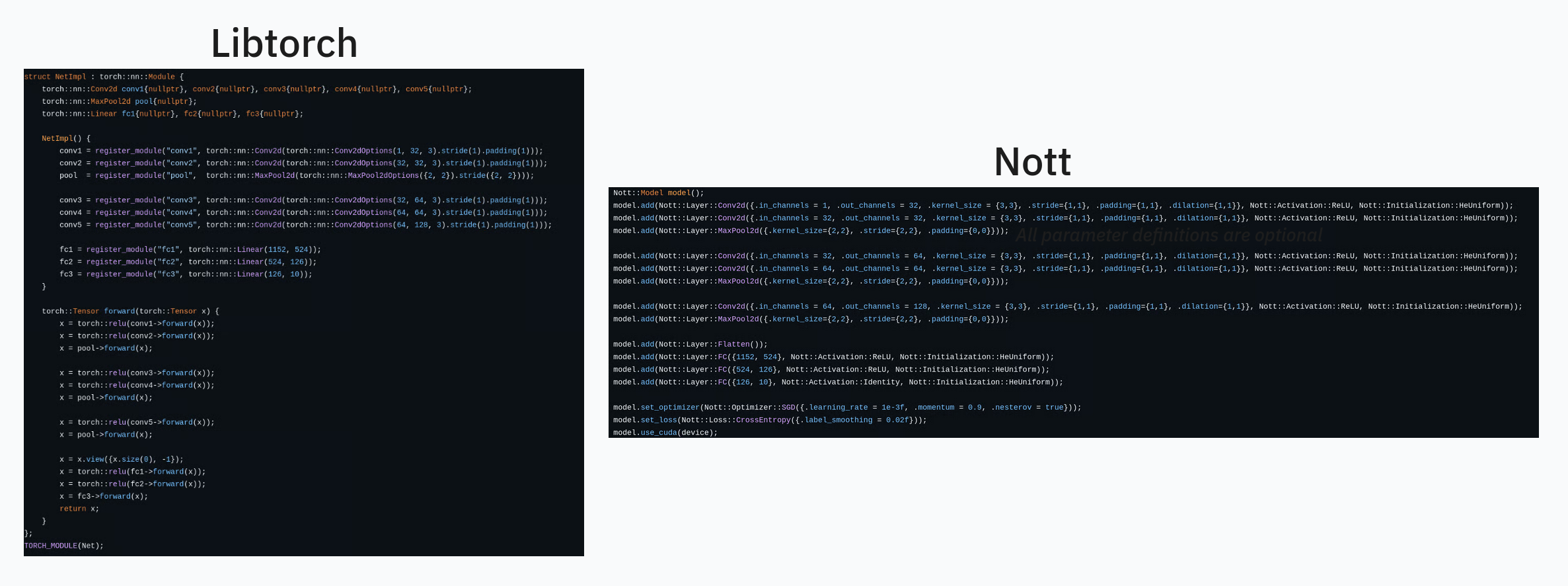 Nott is an infrastructure project: a reusable C++ deep-learning framework that layers a cohesive, strongly typed API over LibTorch while preserving explicit control over GPU execution and runtime behavior. The goal is to keep research iteration close to the metal (predictable performance, controllable memory/layout, explicit execution modes) without sacrificing safety, composability, and reproducibility across repeated training runs. Architecture and authoring center around a directed acyclic graph (DAG) representation of models. Networks are expressed as layers and higher-order blocks that compose into linear or non-linear topologies. This graph-first design supports both rapid composition for standard architectures and explicit wiring for more complex structures, while maintaining a consistent, descriptor-driven configuration surface across the framework. A core differentiator is the deliberate exposure of GPU-oriented runtime controls that typically get abstracted away. Nott is designed to make performance-critical knobs explicit and auditable: CUDA Graph execution to reduce launch overhead and stabilize step time, Tensor Core-oriented execution where applicable, and controllable memory formats/layouts (e.g., NHWC vs NCHW) to match kernel expectations and hardware efficiency. These controls are intended to reduce latency variance (jitter) and improve predictability, which is essential both for fair experimental comparisons and for production-like constraints. Nott also treats the training workflow as a first-class system rather than a loose collection of scripts. Data ingestion and preprocessing are integrated via dataset loaders, data manipulation utilities (augmentation/normalization/splitting/shuffling), and data checks that keep assumptions explicit and help prevent silent dataset issues. Training and evaluation are exposed through unified APIs with configurable runtime options (batching, validation behavior, mixed precision/graph modes when enabled) and a large metrics suite to standardize measurement across experiments. For monitoring and diagnosis, Nott integrates visualization/telemetry through a GNUplot wrapper to keep experiment observability close to execution. For model understanding and validation, interpretability tools (e.g., Grad-CAM, LIME, Shapley-style explanations) are included to support debugging, failure analysis, and research reporting.